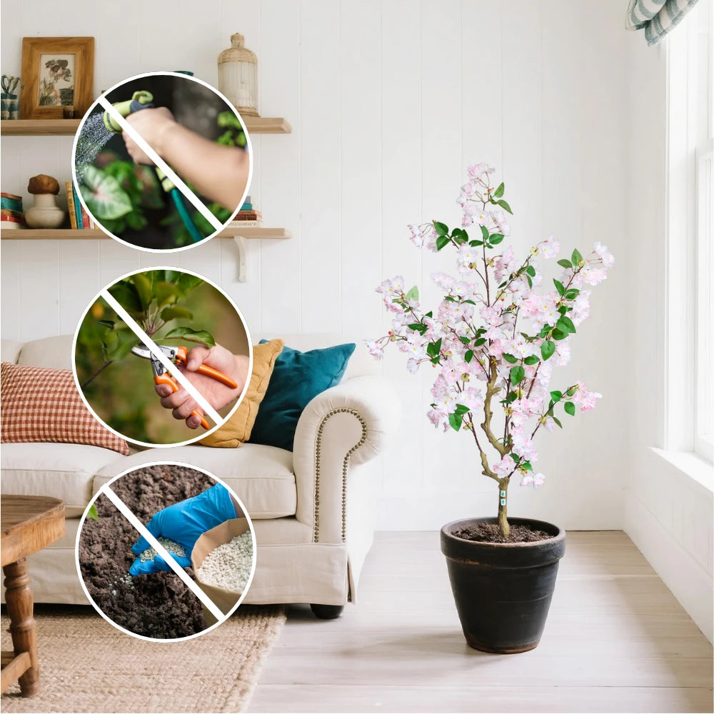 This artificial cherry blossom tree is evergreen all year round and requires no maintenance - no watering, fertilizing or pruning. It is made of high-quality PEC material, which looks realistic, durable, and not easy to fade. It is suitable for any space and can easily create a natural look.